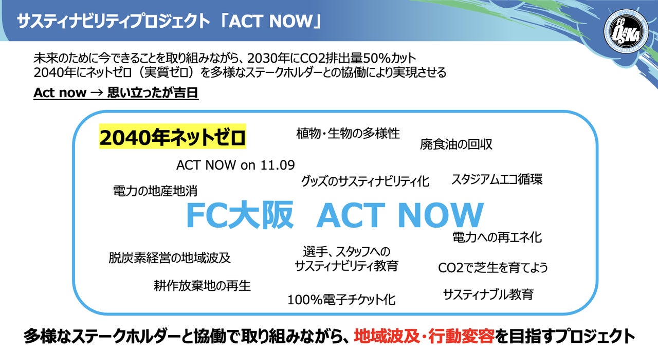 FC大阪は経営理念として地域価値の共創を掲げ、社会のHUB、結節点としてあらゆるステークホルダーと社会連携事業に取り組んで参りましたが、それらのアクションを更に活性化させるために、本年からFC大阪ACT NOWプロジェクトと総称してサスティナビリティプロジェクトをスタート致します。