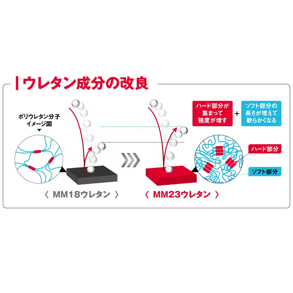さらに反発力の向上を追求し、ウレタン成分そのものも、軟らかいながらも粘りのある性質に改良した「MM23専用ウレタン」を開発。