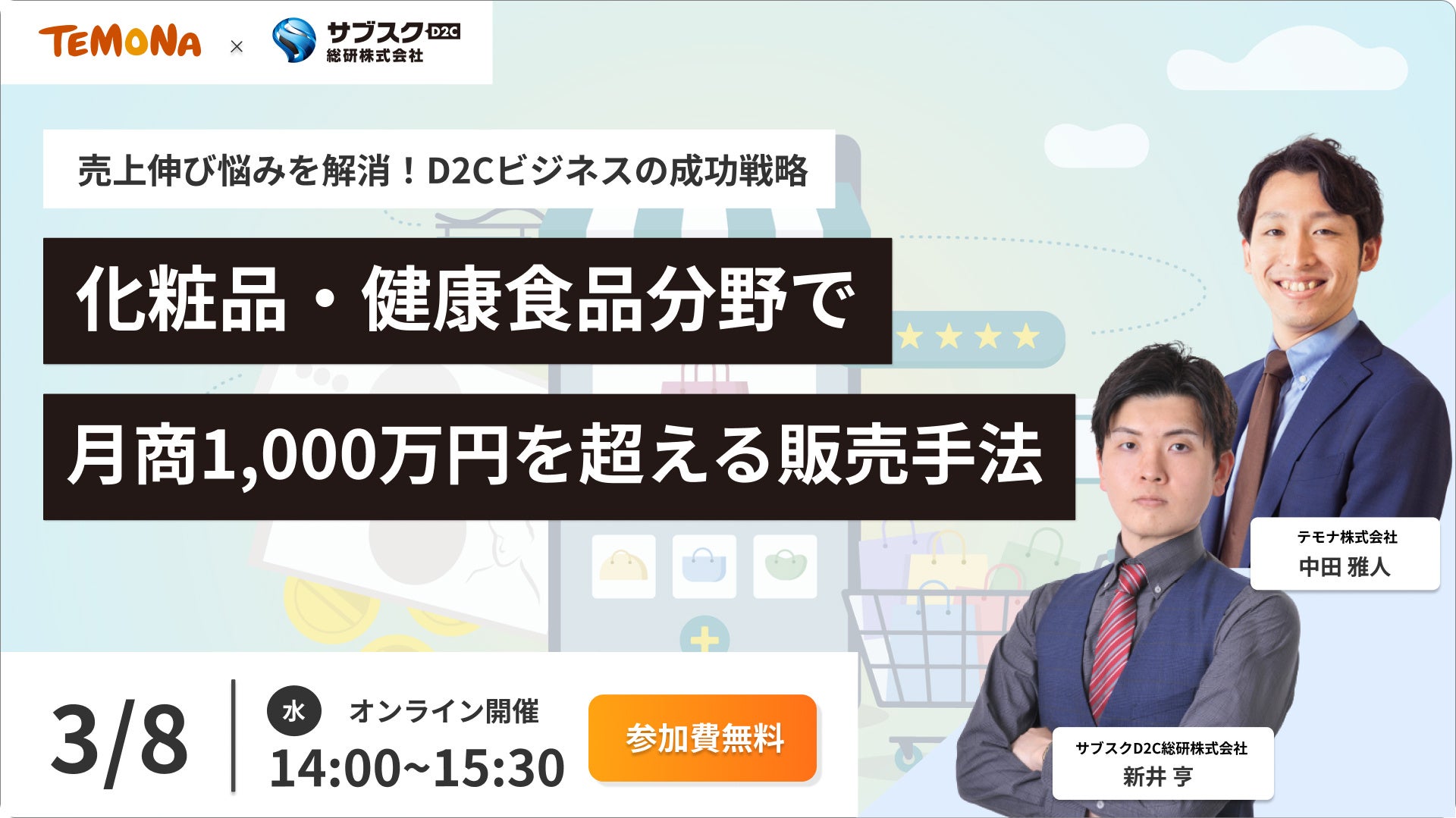 | 当日の内容 | 売上伸び悩みを解消!D2Cビジネスの成功戦略 ~化粧品・健康食品分野で月商1,000万円を超える販売手法~ 14:00~14:40 第一部:サブスクD2C総研株式会社 D2Cビジネスを成功に導く事業戦略・仕組み化・販売方法について 月商1000万円超えるために必要なこと 14:40~15:20 第二部:テモナ株式会社 業界シェアNo.1だから実現できる新規顧客獲得につながるサービス設計 〜独自な機能やノウハウで事業成長を実現〜 15:20~15:30 第三部:質疑応答 |