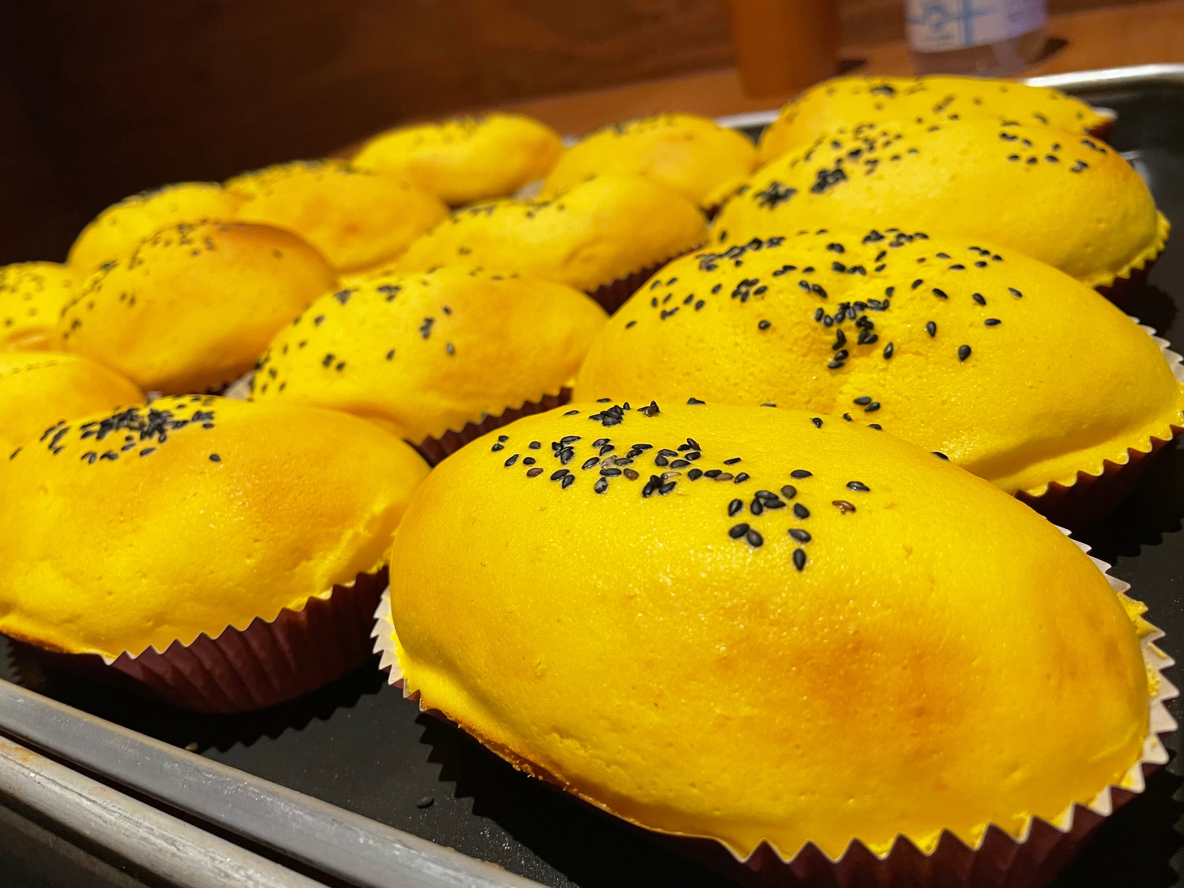 「当店オリジナルで開発したザクザクとしたクッキー生地と優しい甘さの生地が美味しい『メロン食パン』は、大きめサイズでそのままかかじりつくもよし、スライスするもよし。事前予約限定で販売しています。『いも吉』は、私が研修の時から大好きなパンで、個人的におすすめして、お客様にもお楽しみいただいております。」