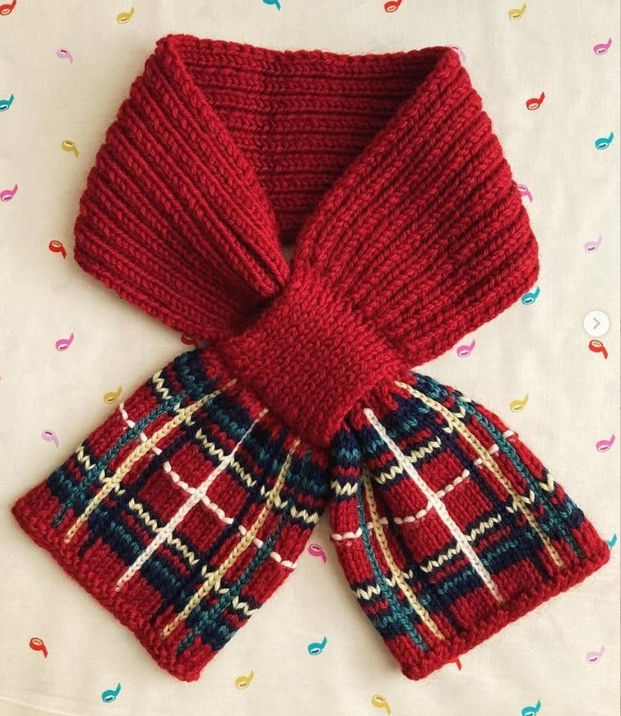 SNSで話題の「赤いチェックのマフラー」を講師が新たに起こした編み図で一緒に編みます。