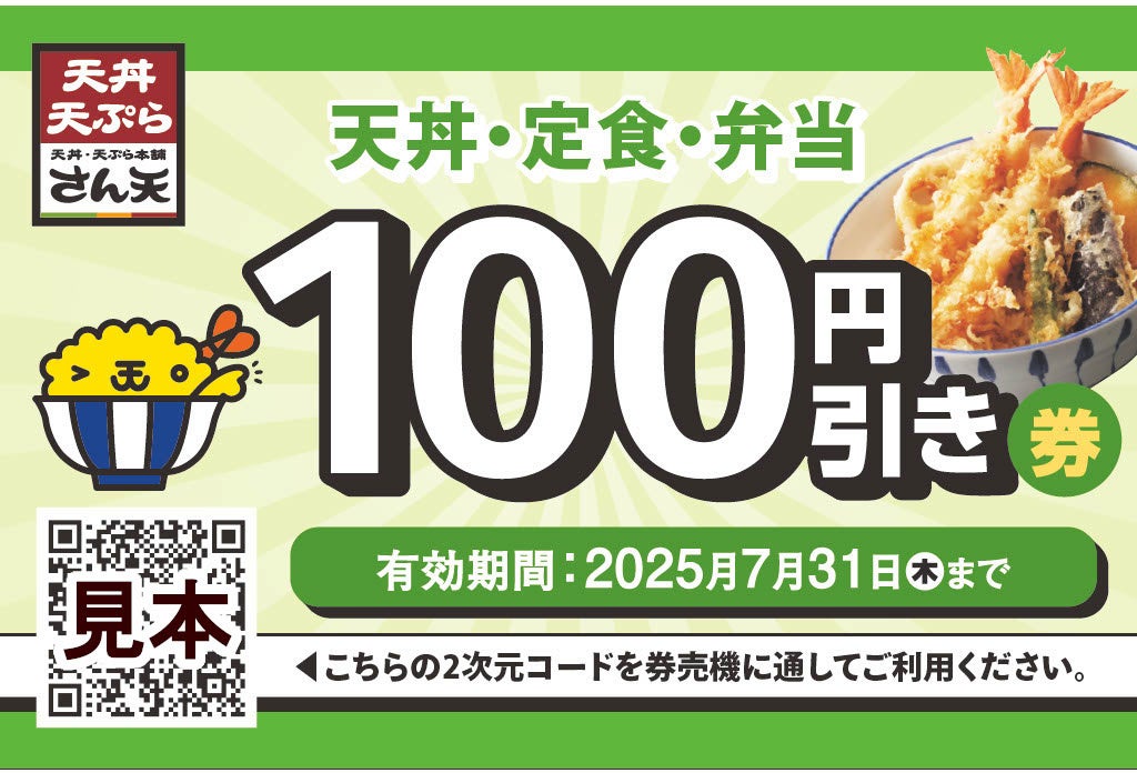 「100円引き券」は、期間限定商品の天ぷら屋のうな重をはじめ、各種天丼や定食にご利用いただけます。