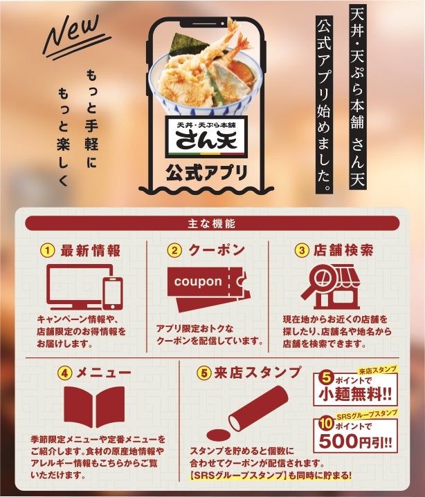 さらに「天丼・天ぷら本舗 さん天」公式アプリでは、フェア商品でお使いいただける30円引きクーポンを配信いたします。ぜひ、お得にご利用ください。