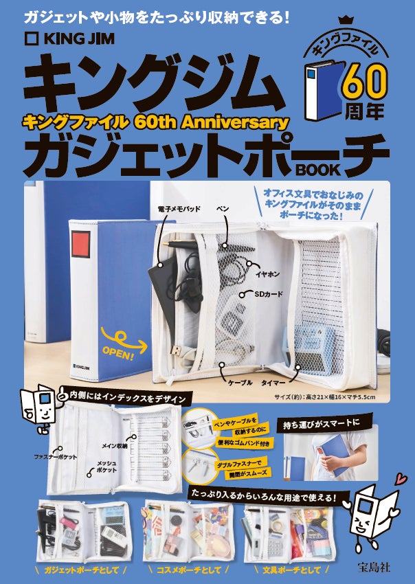 「キングファイル」の発売60周年を記念して、宝島社より「キングジム キングファイル 60th Anniversary ガジェットポーチ BOOK」が発売されます。注目は「キングファイル」そっくりなオリジナルガジェットポーチ。