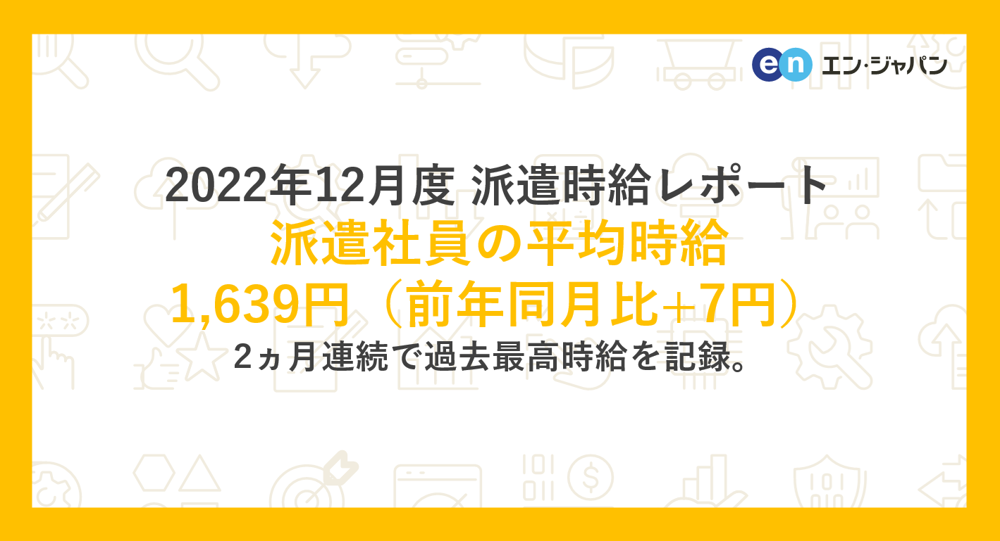 2022年12月度 派遣社員の平均時給は1,639円2ヵ月連続で過去最高時給を記録。