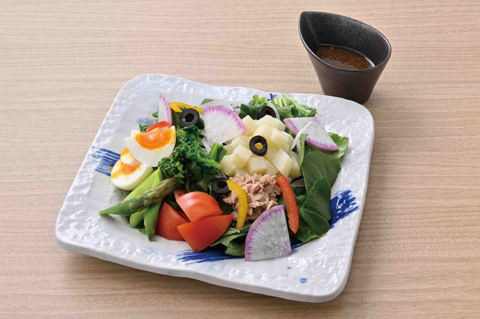その名の通り、13種類の食材を彩り豊かに盛り付けた、見た目にも鮮やかで食欲をそそるサラダです。「菜の花」「トマト」「むらさき大根」「赤パプリカ」「黄パプリカ」「じゃがいも」「グリーンカール」「ほうれん草」「アスパラ」「ブラックオリーブ」「玉ねぎ」「ツナフレーク」「半熟玉子」