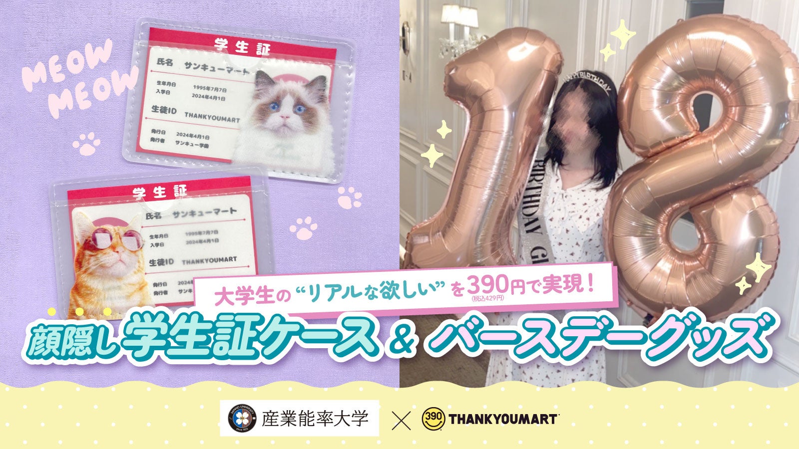現役大学生のリアルな”欲しい”を390円(税込429円)で実現!サンキューマートが産業能率大学との産学連携企画として「顔隠し学生証ケース」「バースデー装飾アイテム」を新発売