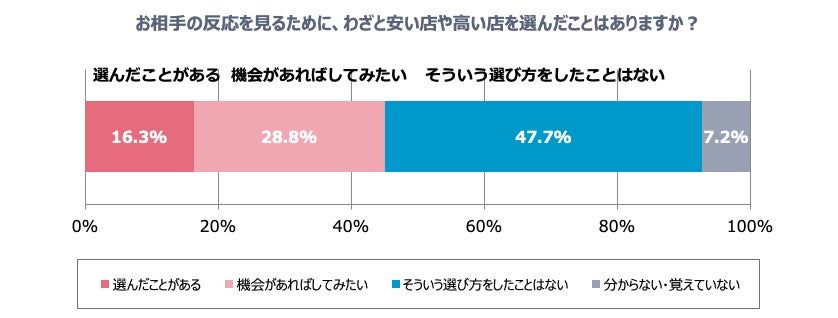 「デートで行く飲食店を選んだ経験がある」20〜30代の独身男性472人に聞いたところ、16.3%がお相手の反応を見るために、わざと安い店や高い店を「選んだことがある」と答えました。