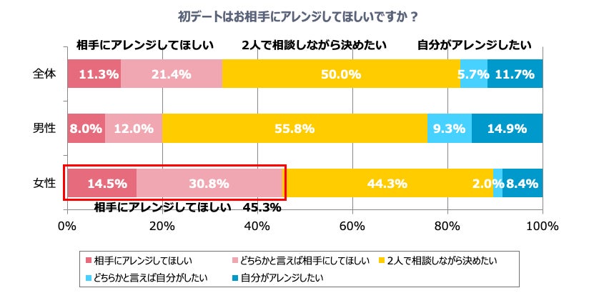 女性の45.3%が「相手にアレンジしてほしい」と回答していますが、ほぼ同率の44.3%が「2人で相談しながら決めたい」とも答えています。