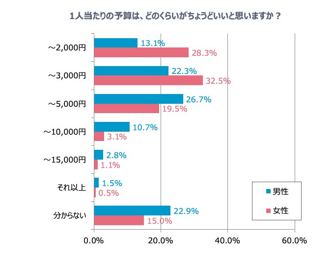 ちょうどいいと思う1人当たりのデートの予算について聞いたところ、男性は「〜5,000円」が26.7%で最多、女性は「〜3,000円」が32.5%で最多でした。