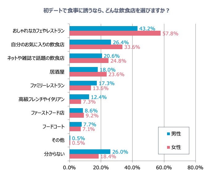 - 初デートで食事に誘うなら「おしゃれなカフェやレストラン」男女共に第1位