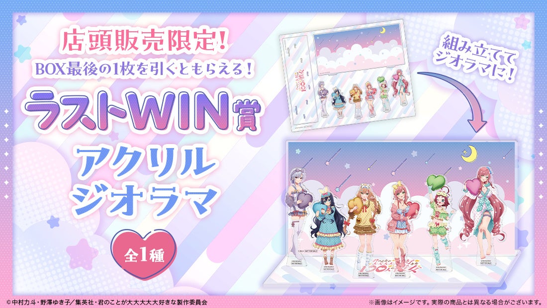 また、店頭限定ラストWIN賞では描き下ろしの彼女たちを全員飾れるアクリルジオラマをラインナップ。
