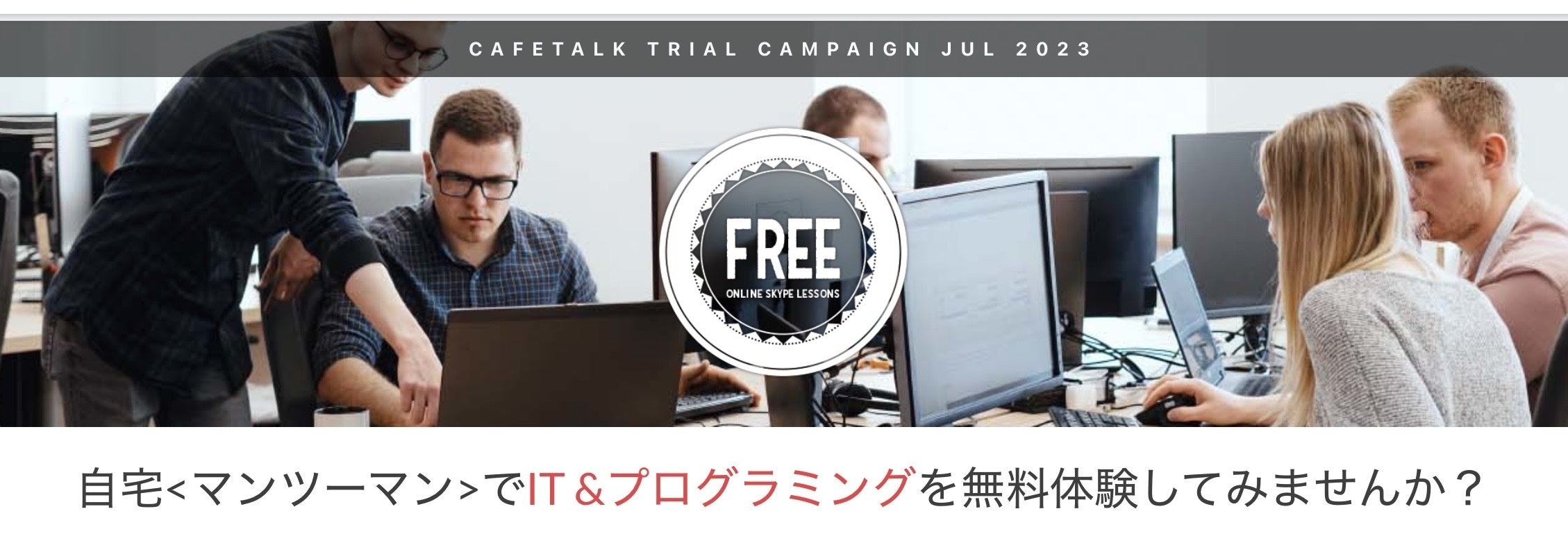 オンラインでスカイプ or Zoomを使ってご自宅で受講できる、オンラインプラットフォーム「カフェトーク」のIT&プログラミングカテゴリのオンラインレッスン の無料モニター、最大10名様を募集致します。