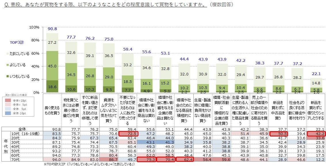 - 買い物の際に環境・社会に与える影響をどの程度意識しているか10点満点で聞いたところ、最も高かったのはシニア層で、70代が平均5.84点、60代が5.26点。10代(16~19歳)も平均5.05点と高めだが、「まったく意識していない」割合も高く、環境・社会意識が高い層と低い層で両極化の傾向。