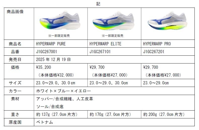 ミズノは、3D形状のフルレングスカーボンプレートを搭載したスピードランナー向けの新レーシングシューズ「HYPERWARP(ハイパーワープ)」シリーズを、12月19日に全国のミズノランニング品取扱店で発売します。