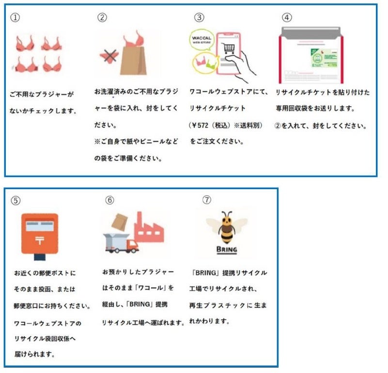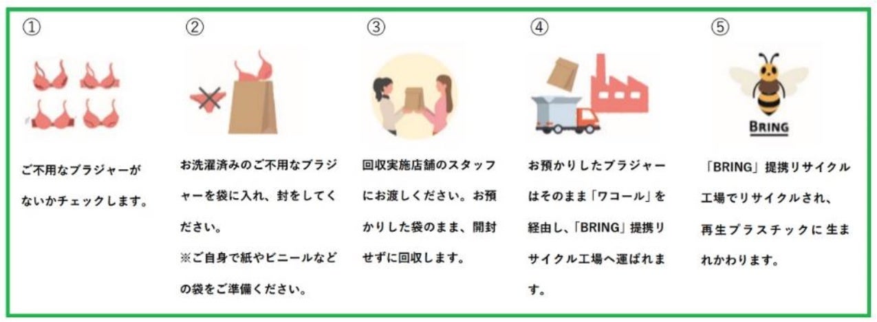「ワコール ブラリサイクル」は、株式会社JEPLANが運営する衣類回収サービス「BRING™」に参画しており、不用になったブラジャーをご家庭にある紙袋やビニール袋に入れて実施店舗にご持参いただくと、「BRING」の提携工場でリサイクルされ、再生プラスチックに生まれかわります。