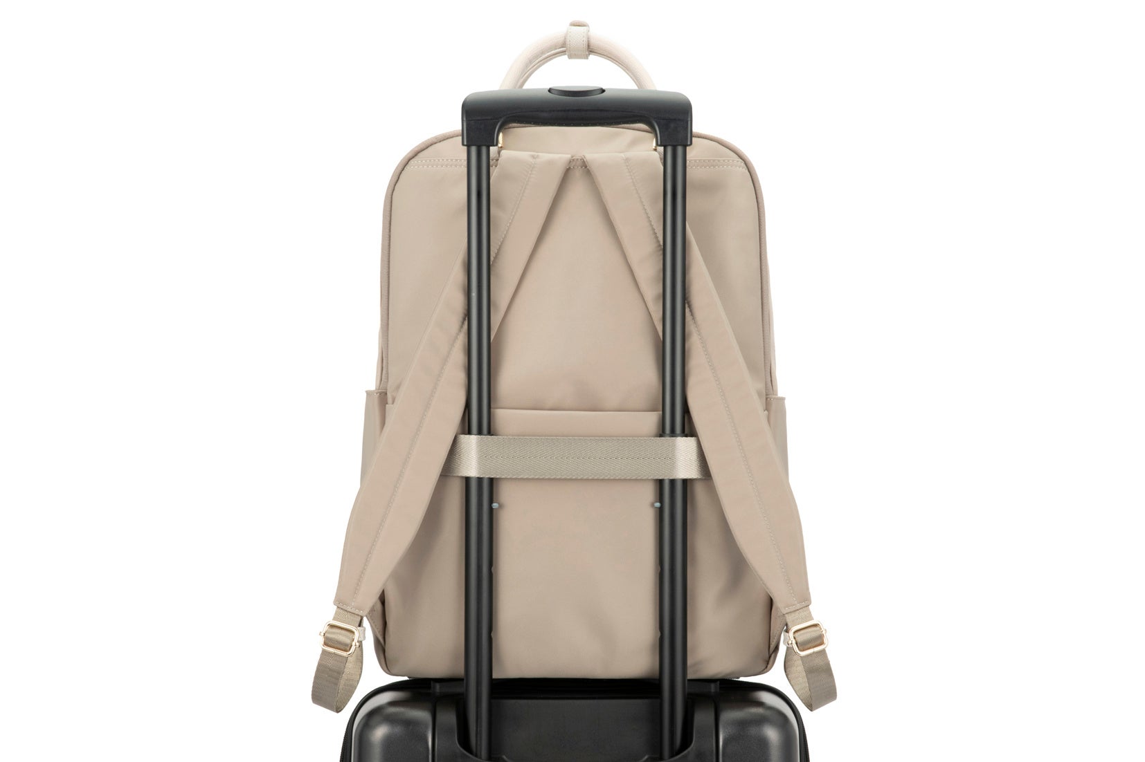 背面に、スーツケースのプルドライブハンドルに固定して持ち運べる「セットアップ機能」を搭載。