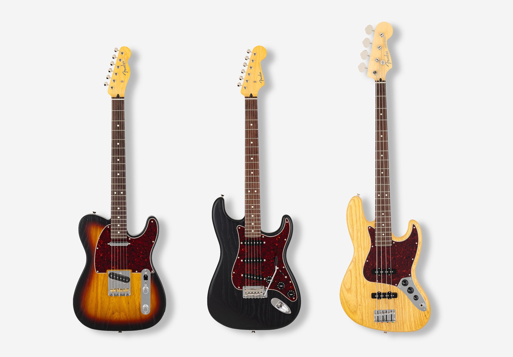ボディに貴重なアッシュ材を使用したオープンポアフィニッシュのテレキャスター、ストラトキャスター、ジャズベースが登場!
