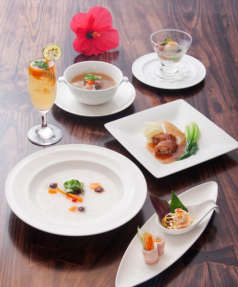 ランチはたんかんとゴーヤーのミックスジュースから始まり、シェフ特製のフカヒレの煮込みや薬膳粥など、美肌にこだわったメニューで。