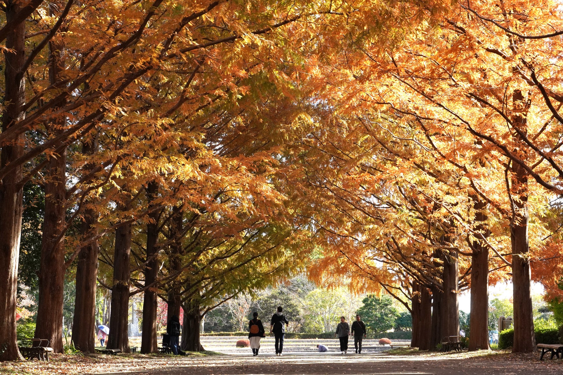 会場から徒歩約3分のところには、メタセコイアの並木道があります。南口付近「泉の広場」から「プレジャーガーデン」を結ぶ約100mにわたる並木道で、紅葉するとレンガのような色合いになります。メタセコイアは現在紅葉はじめで、12月上旬までお楽しみいただける見込みです。