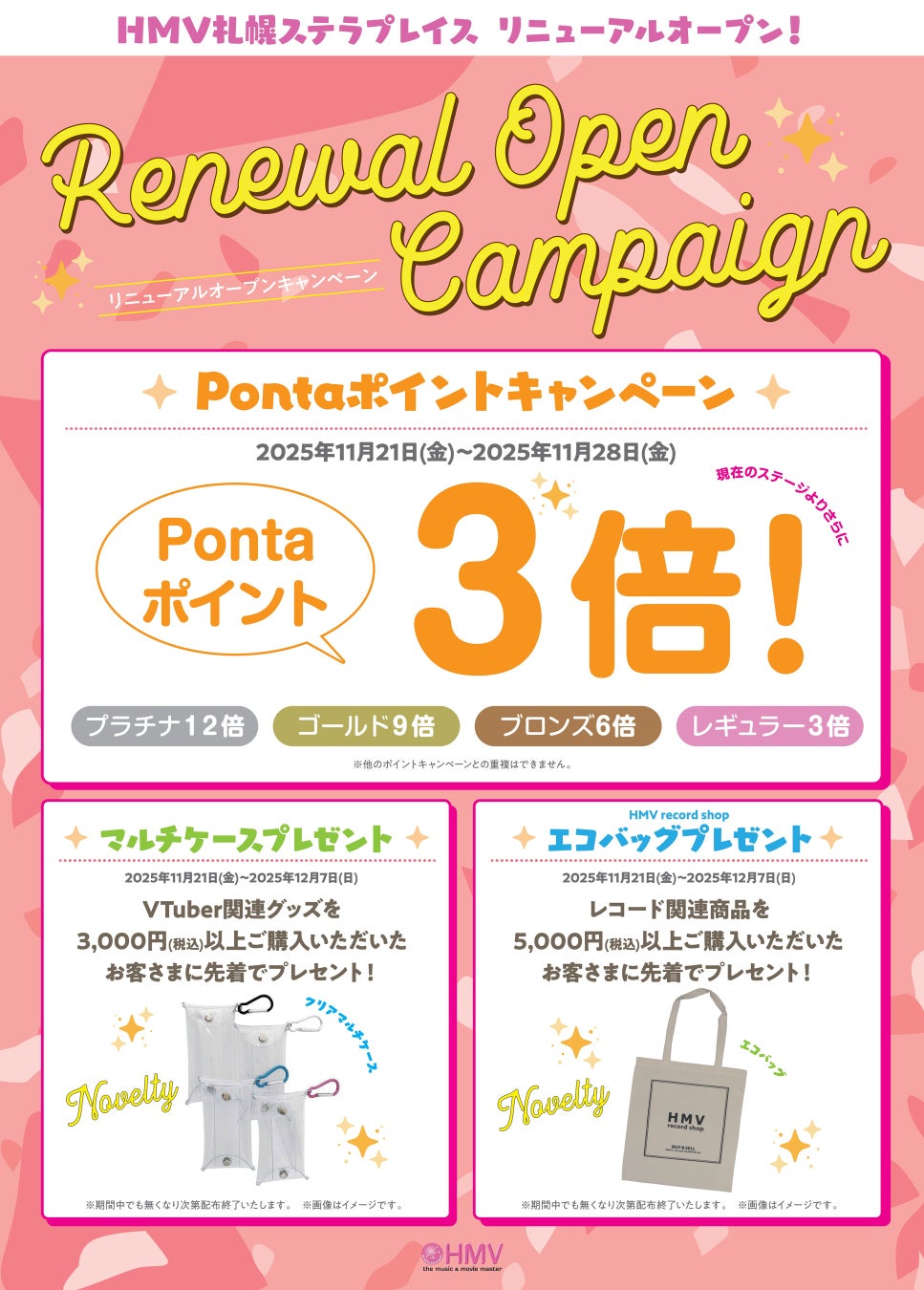 リニューアルオープンを記念したポイント施策やプレゼント施策なども実施いたしますので、この機会にぜひ、リニューアルされた「HMV札幌ステラプレイス」へご来店ください。