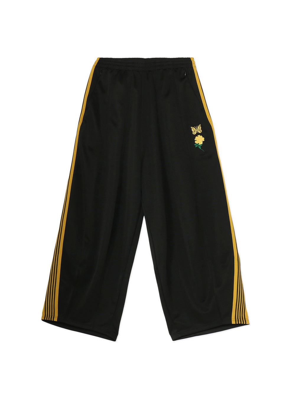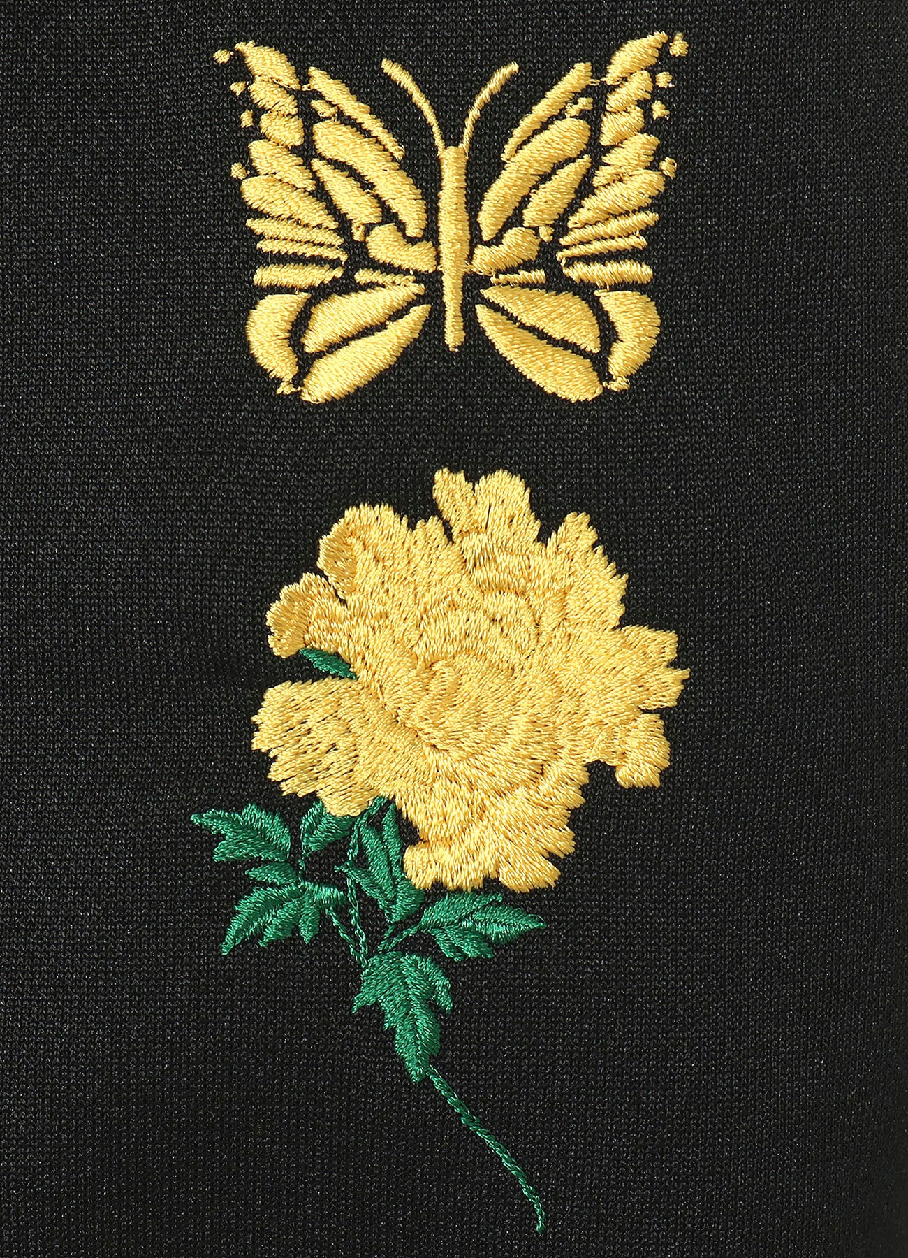 定番の型とは異なり全体的にリラックス感を取り入れた”Warm Up”シリーズでは、ジャケットの裾リブが取り払われ、パンツはよりワイドフィットなシルエットになっている特別なデザインとなっています。また、ポケットは全てジップタイプのシームレス仕様で、ジャケットのフロントやパンツのバックに斜めに配置しています。今回のコラボレーションではイエローのラインを採用し、<NEEDLES>を象徴する蝶と、ヨウジヤマモトのアイコニックなモチーフの牡丹の花もイエローにカスタムしました。