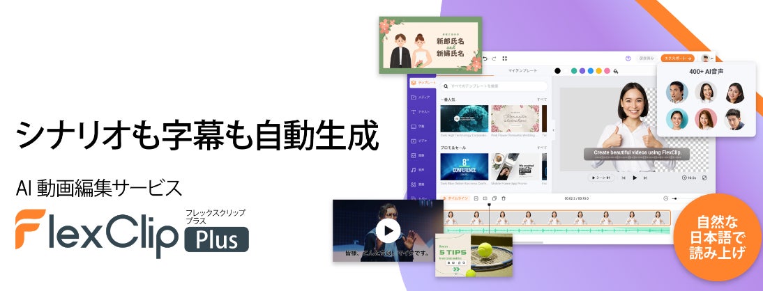 FlexClipはクラウドベースのオンライン動画編集サービスです。豊富な動画テンプレートや素材が用意されており、ビジネス用途から趣味の動画まで、さまざまなジャンルの動画をwebで作成・編集できます。AIを活用した機能も多数搭載されており、簡単かつ効率的に動画を編集できます。
