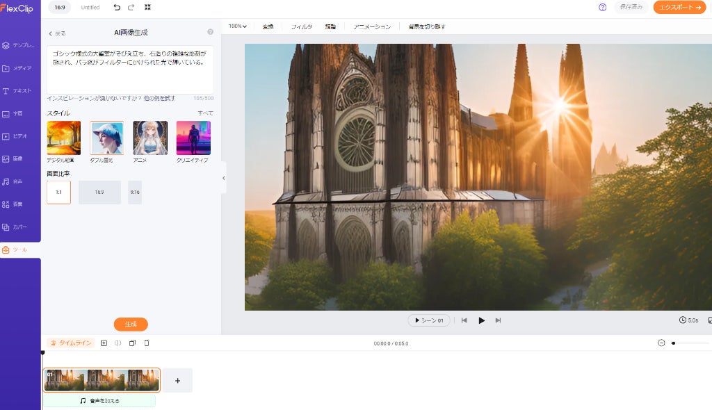 テキストで指示して画像を生成できます。リアルな写真、アニメ、3Dなど、さまざまなスタイルの画像を生成し動画編集に活用できます。