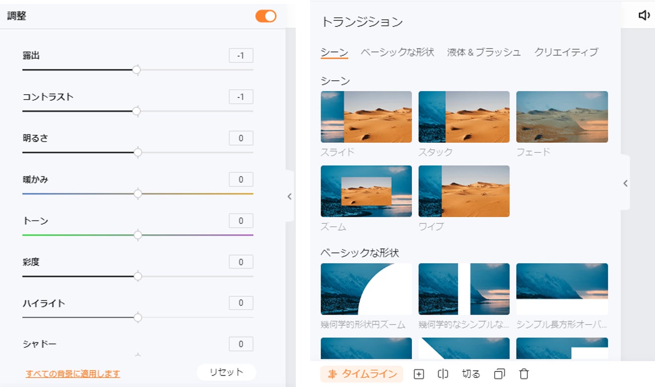 色補正、エフェクト追加、高度なトランジション、BGMや効果音の追加など高度な編集機能も搭載しています。より魅力的な動画を仕上げられます。