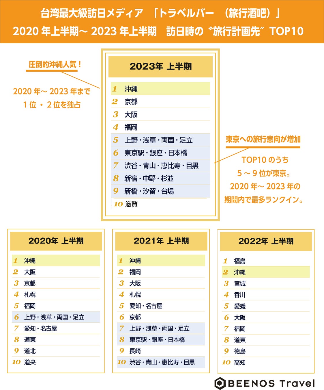 旅行酒吧(トラベルバー)はサイト内で日本旅行の情報収集や旅行計画づくりができ、台湾、香港、マカオなどの訪日への意欲が高いユーザーに支持されています。本格的な訪日観光の復活が進む現在、BEENOS Travelは、国内事業者様に向けたインバウンド情報提供の一環として本ランキングを発表いたします。