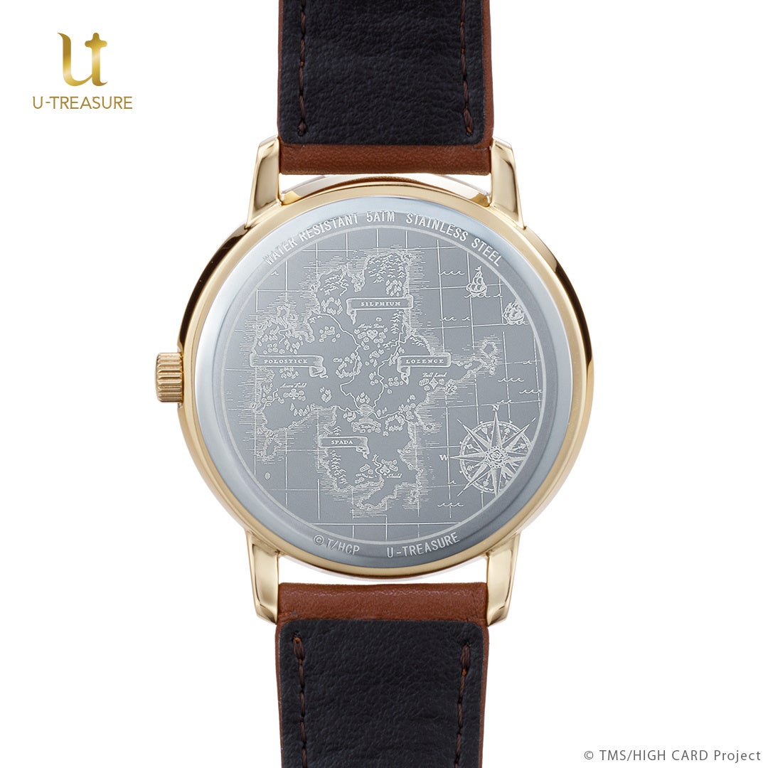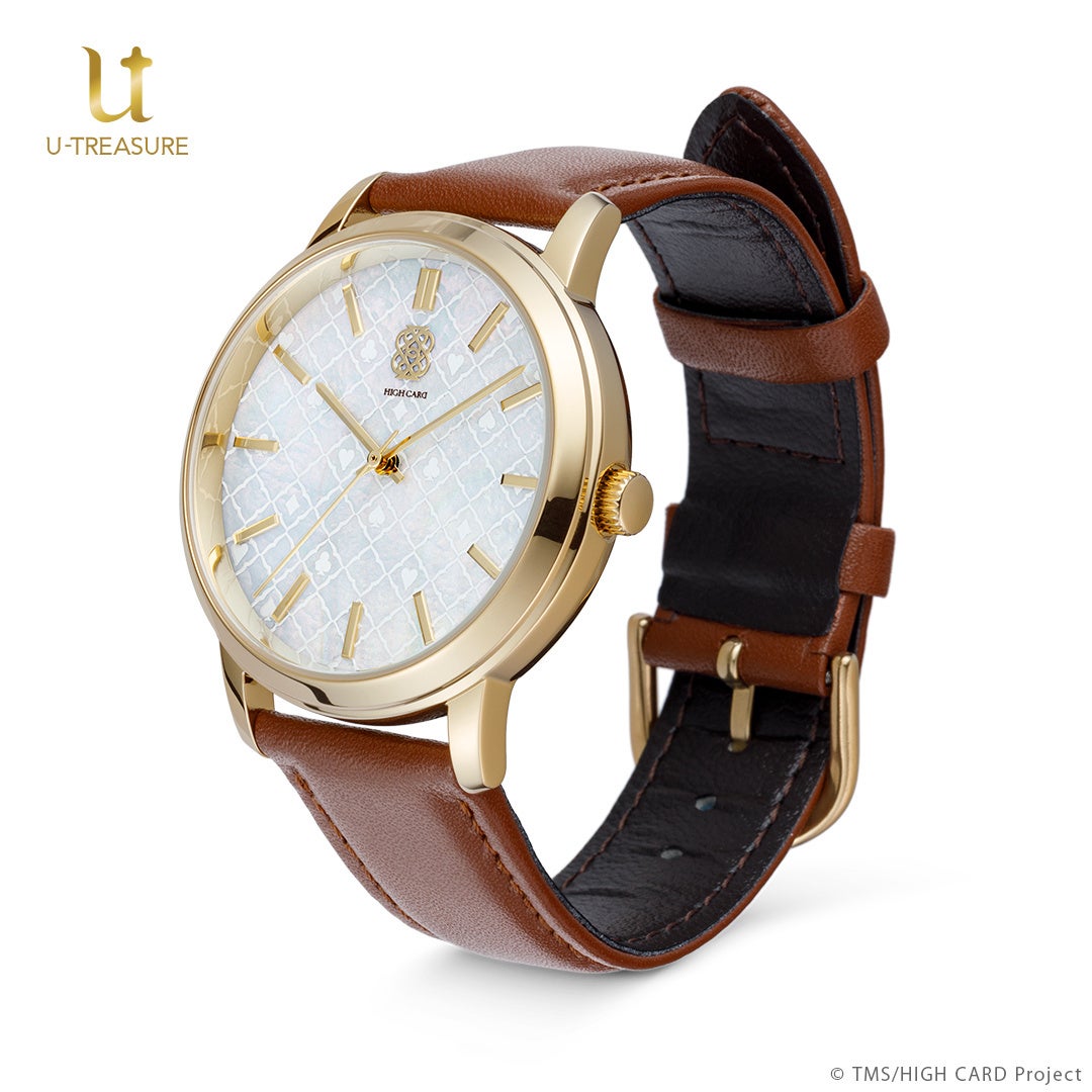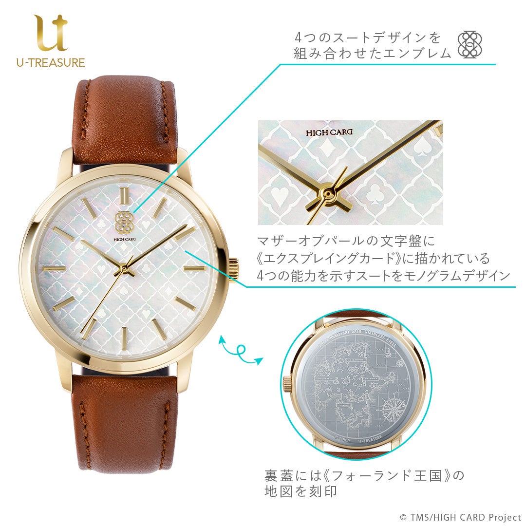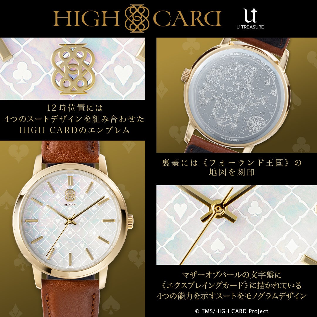 【300本限定】 「HIGH CARD」の世界観をさりげなくデザインに取り入れた腕時計が登場。 文字盤は、特定の者に異能力を与える52枚の《エクスプレイングカード》に描かれている4つの能力を示すスートをモノグラムデザイン。 12時位置へは4つのスートデザインを組み合わせたHIGH CARDのエンブレムを施しました。 裏蓋には物語の舞台でもある《フォーランド王国》の地図を刻印。 インデックス、時針、秒針、ケースを華やかなゴールドで統一し、革ベルトにはシックなブラウンを採用することで、 手元から気品漂うクラシカルな装いを演出します。 Are you ready? It's showdown!! 300本の数量限定となります。 |