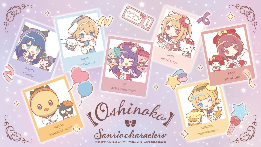 各キャラクターのコラボレーションは、ハローキティ×ルビー、マイメロディ×有馬かな、リトルツインスターズ×アイ、ポムポムプリン×MEMちょ、シナモロール×アクア、クロミ×黒川あかね、バッドばつ丸×ぴえヨンです。