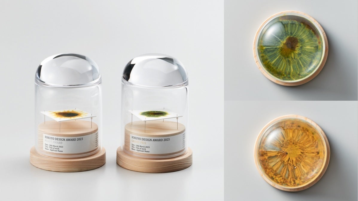 受賞者には、メインビジュアルで用いた草木染の手法を使い、森や泉のような多様な自然によりフォーカスするガラスドーム型のトロフィーと、同じく草木染による標本をイメージした表彰状が授与されました。多様なものが入り交じることで生まれる混沌とした美しさを表現しています。