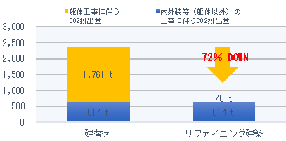 既存躯体の再利用により、建替えと比較して主に躯体工事に伴うCO2排出量を70%以上削減できます(※)。