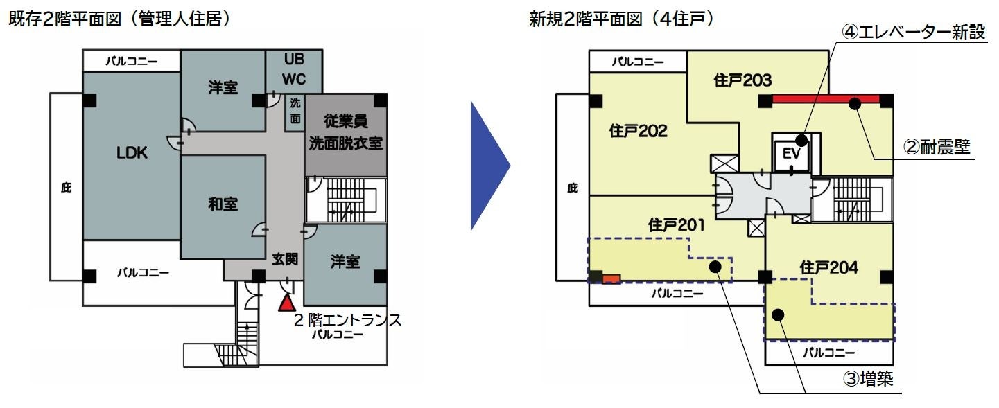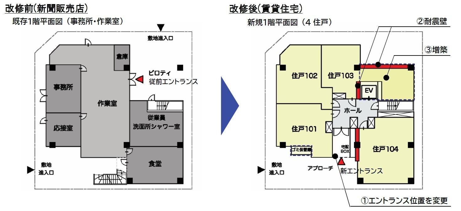 賃貸住宅としての間取りを成立させるために躯体壁の一部を撤去、また耐震補強工事として外観や居住性に影響の少ない位置に耐震壁を配置。