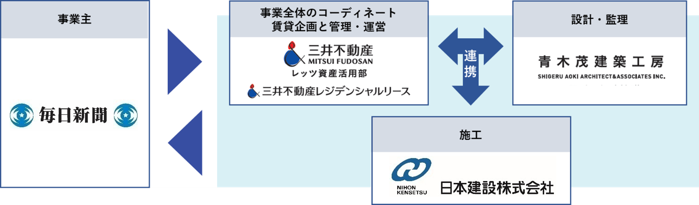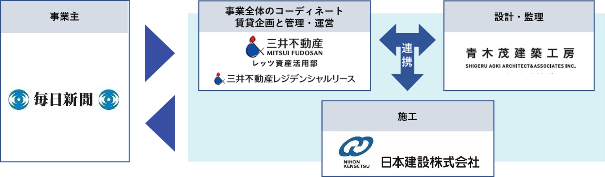 本事業は、建物所有者および建物投資の事業主を毎日新聞社、事業全体のコーディネートを三井不動産レッツ資産活用部、賃貸企画・建物竣工後の運営管理を三井不動産レジデンシャルリース、設計・監理を青木茂建築工房、施工を日本建設株式会社が担当しております。