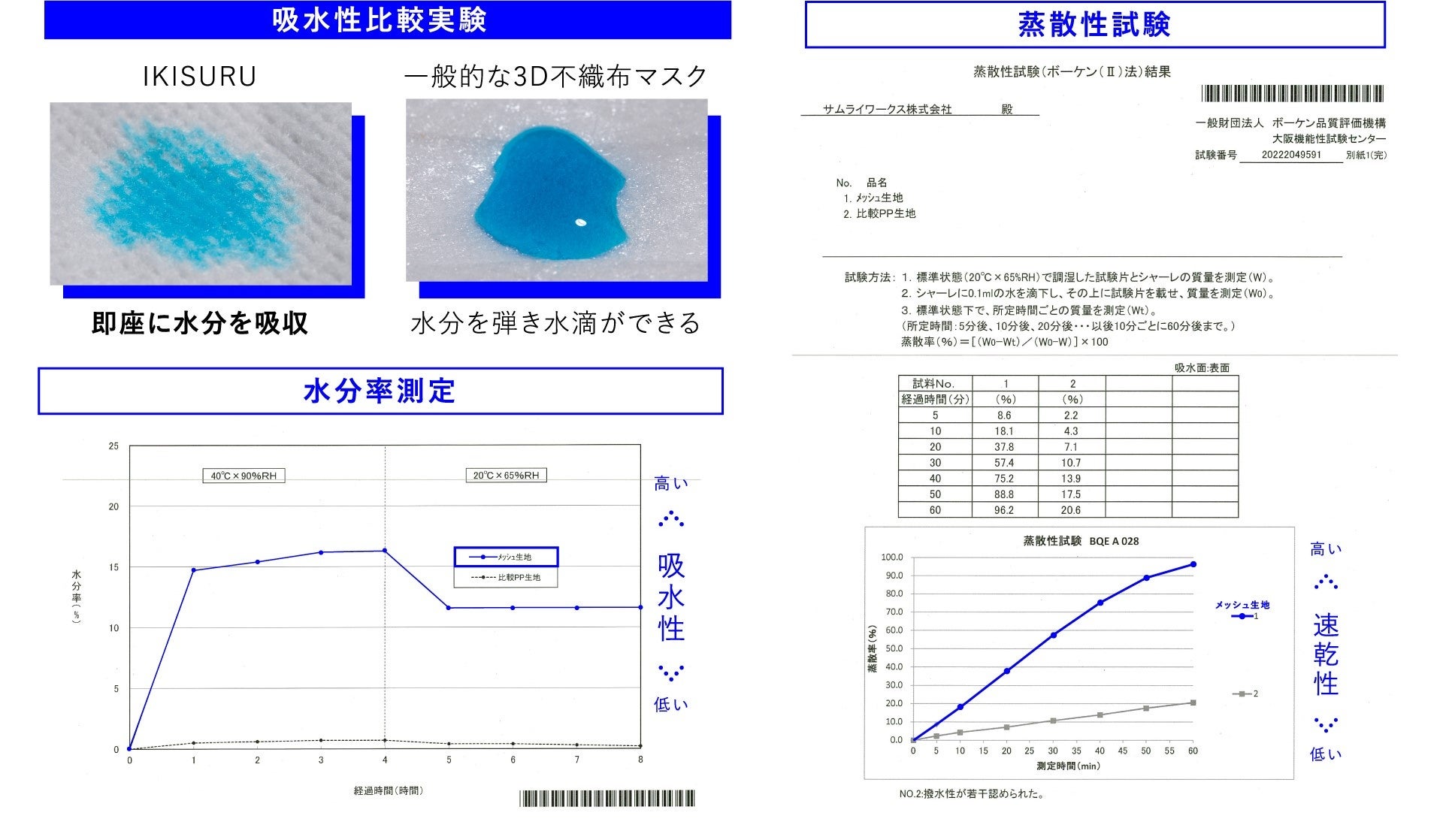 IKISURUは、一般的な3D不織布マスクと比較して約2.8倍の通気性が測定できました。