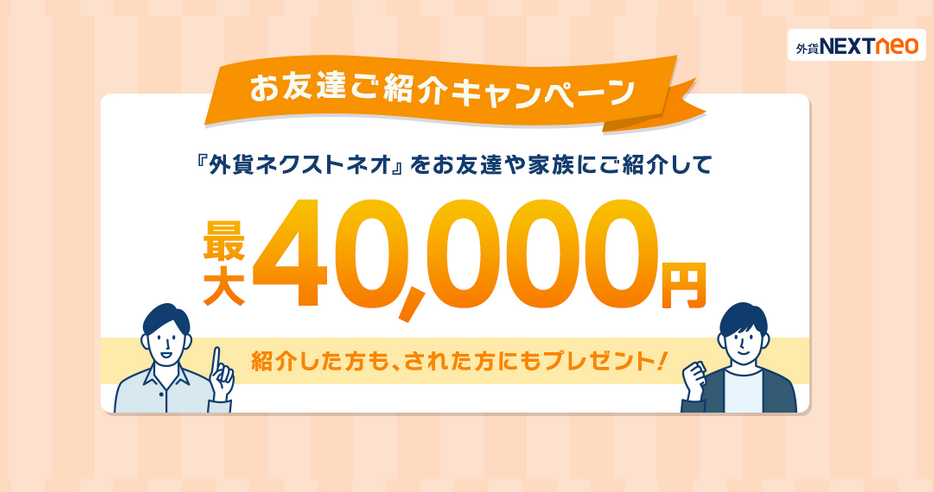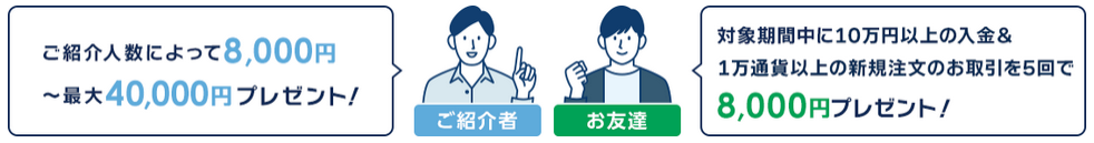 すでに『外貨ネクストネオ』を開設しているお客様(「ご紹介者様」)が、『外貨ネクストネオ』に興味をお持ちの方(「お友達」)を紹介していただき、後日その「お友達」が条件(『外貨ネクストネオ』にて10万円以上の入金(※1)、および1万通貨以上の新規取引を5回以上)を満たされた場合には、「ご紹介者様」と「お友達」の双方にもれなく現金8,000円をプレゼントいたします。