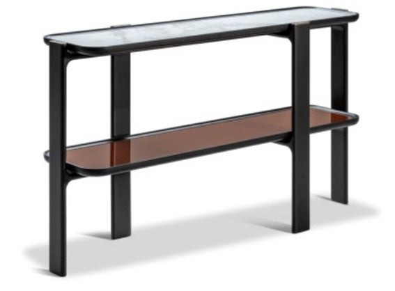 陰影のある繊細なディテールが、気品と洗練さを添えるコンソールテーブル。 異なる仕上げのアッシュ無垢材のフレームが特徴です。棚板はポプラ合板で、フレー ムと同じ仕上げのアッシュ材を使用しています。天板には、お好みに応じて、裏面に塗装を施したガラスや⼤理⽯をお選びいただけます。
