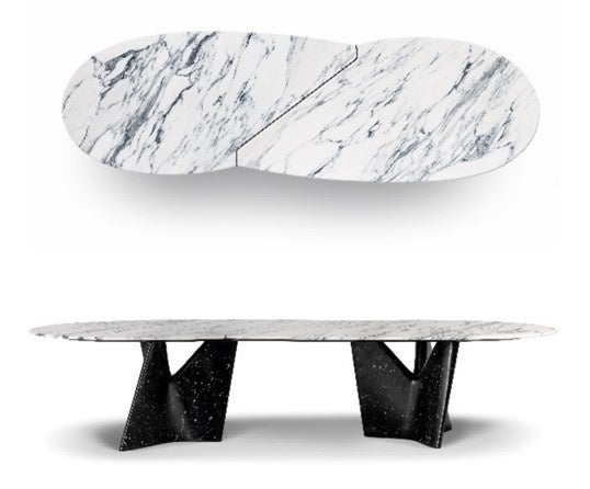 天板にビアンコ・レヴィリアーニ、脚部にはネロ・マルキーナの2種の⼤理⽯を贅沢に用いた、彫刻のような美しいダイニングテーブル。 陰と陽を想起させるだけでなく、無限の可能性と繁栄を象徴する楕円形の天板と、広がる木の枝を表現したなだらかな脚部が躍動感溢れる逸品です。ラグジュアリー感溢れる唯一無二のアイテムです。