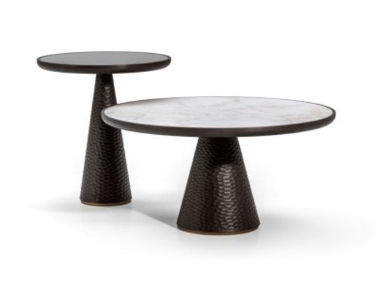 熟練の職人の手仕事により生まれたサイドテーブルは、印象的なフォルムが一際目を惹き、エレガントな雰囲気を醸し出します。天板は⼤理⽯または裏面に塗装を施したガラスからお選びいただけ、フレームはさまざまな仕上げのアッシュ無垢材を使用し、手彫りによる刳り貫き(くりぬき)加工が施されています。