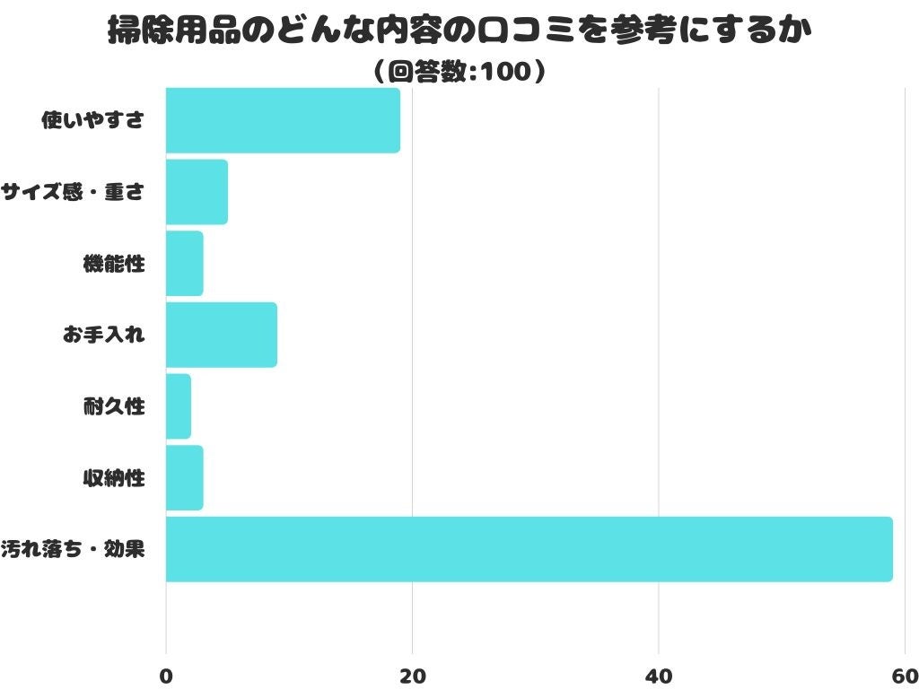 掃除用品のどんな内容の口コミを参考にするかをアンケートにて調査したところ、1位は「汚れ落ち・効果」でした。
