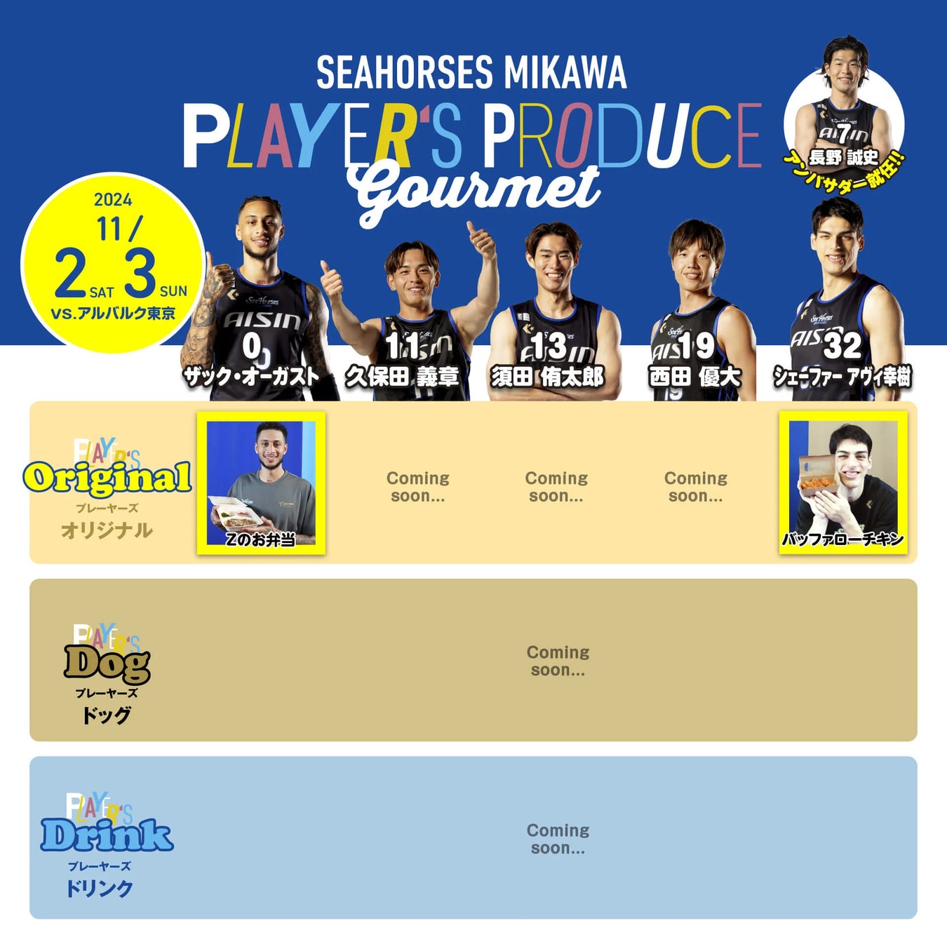 11/2(土)、3(日)アルバルク東京戦にて、バナナフェスとともに選手プロデュースグルメの販売も行います!今回新たに登場したのは、オーガスト選手プロデュースの「Zのお弁当」と、角野選手の「こだわりカレー」、西田優大選手の「グリーンカレー」、長野選手の「加賀棒茶のジェラート」です!