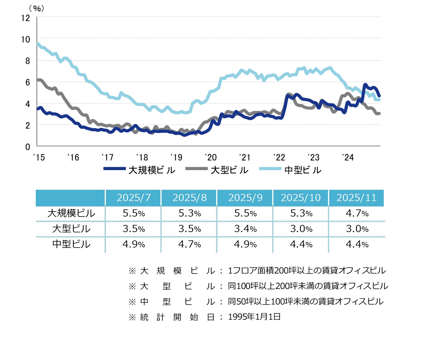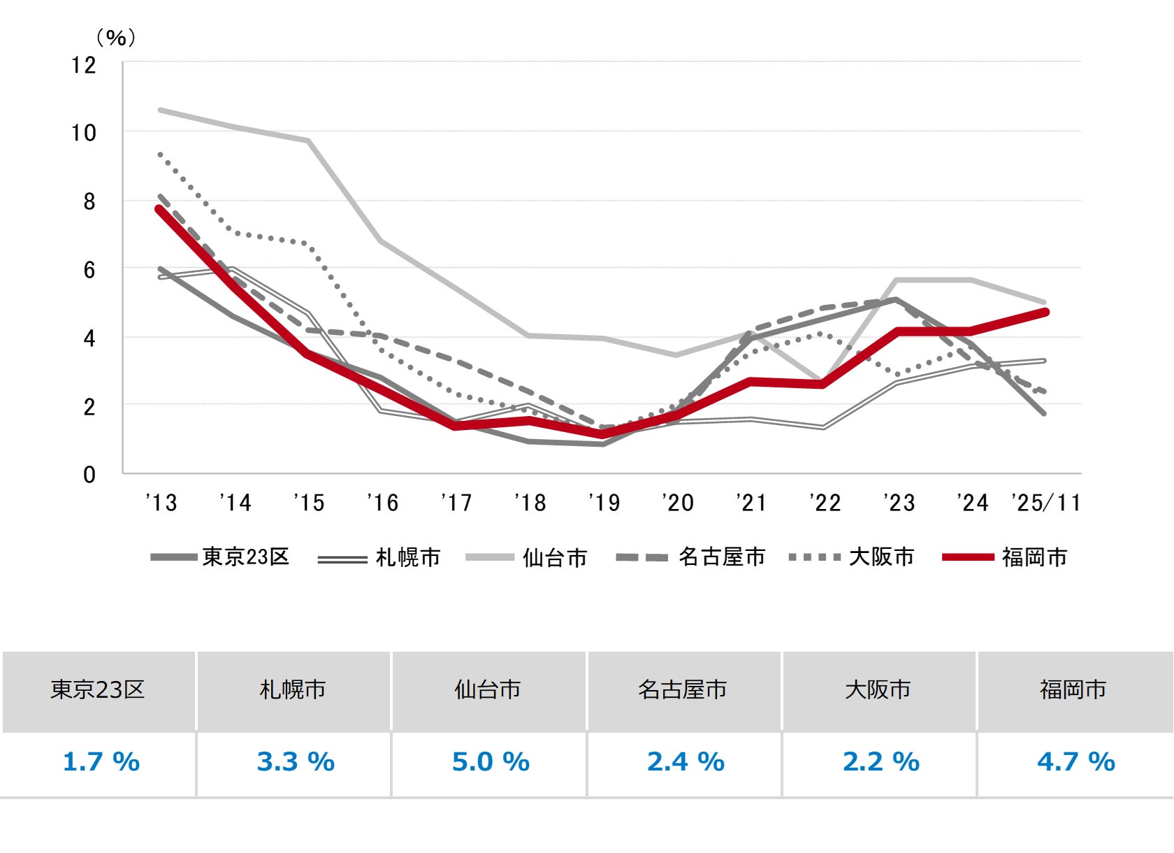 三幸エステート株式会社(本社:東京都中央区、取締役社長:福島正二郎)は、2025年11月度の福岡市オフィス賃貸状況(空室率&現空面積:全規模、募集賃料&募集面積:全規模、規模別空室率、主要エリア※1空室率:全規模)および全国6大都市(東京・札幌・仙台・名古屋・大阪・福岡)の大規模ビルのマーケットデータをまとめた「オフィスマーケット2025年12月号福岡」を公表します。