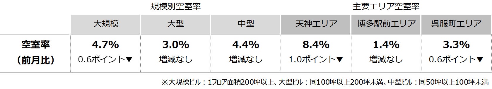 空室率は前月比マイナス0.33ポイントの4.33%と2ヵ月連続で低下した。新築ビルで大口の空室が消化され、主な低下要因となっている。エリア別では「天神」が前月比マイナス1.0ポイントと大幅に低下した。潜在空室率は前月比マイナス0.32ポイントの5.85%だった。