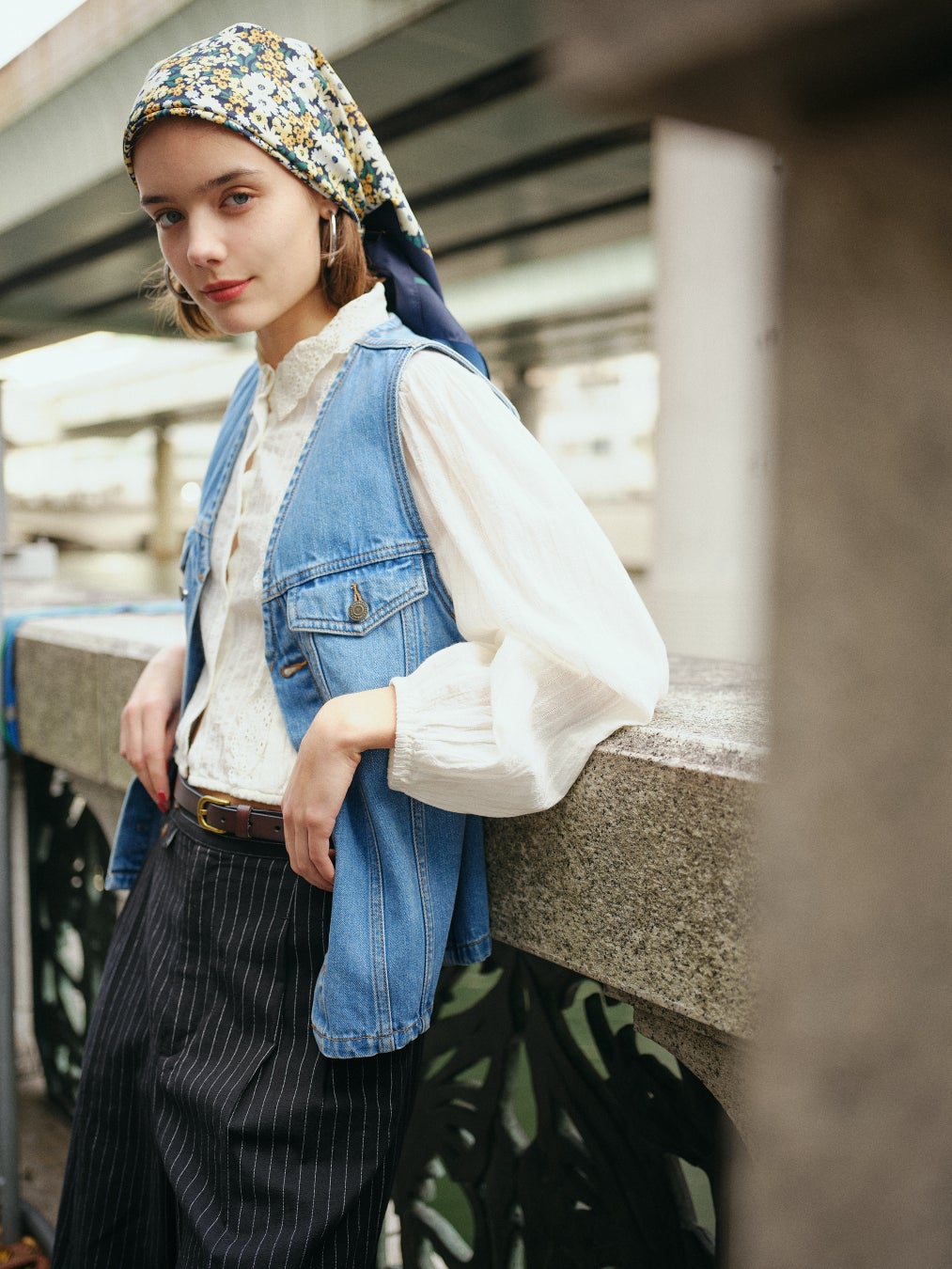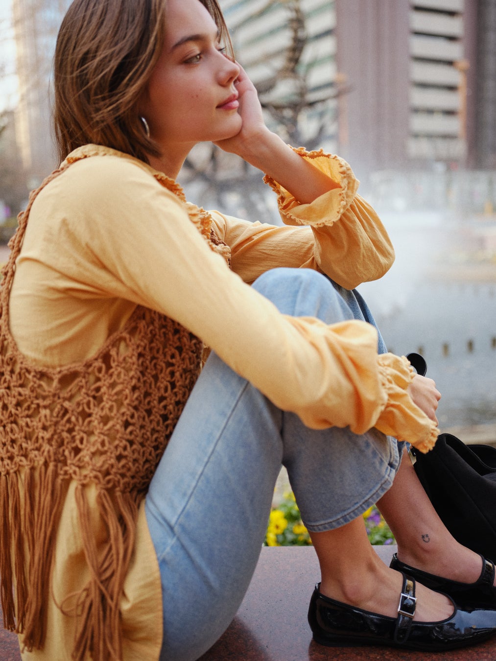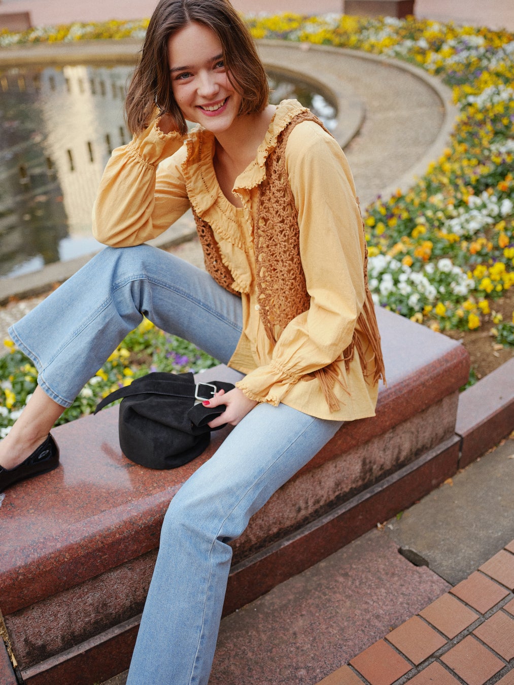フロントにフリルをあしらったコットンブラウスに、手編みのクラフト感が魅力的なフリンジベスト。