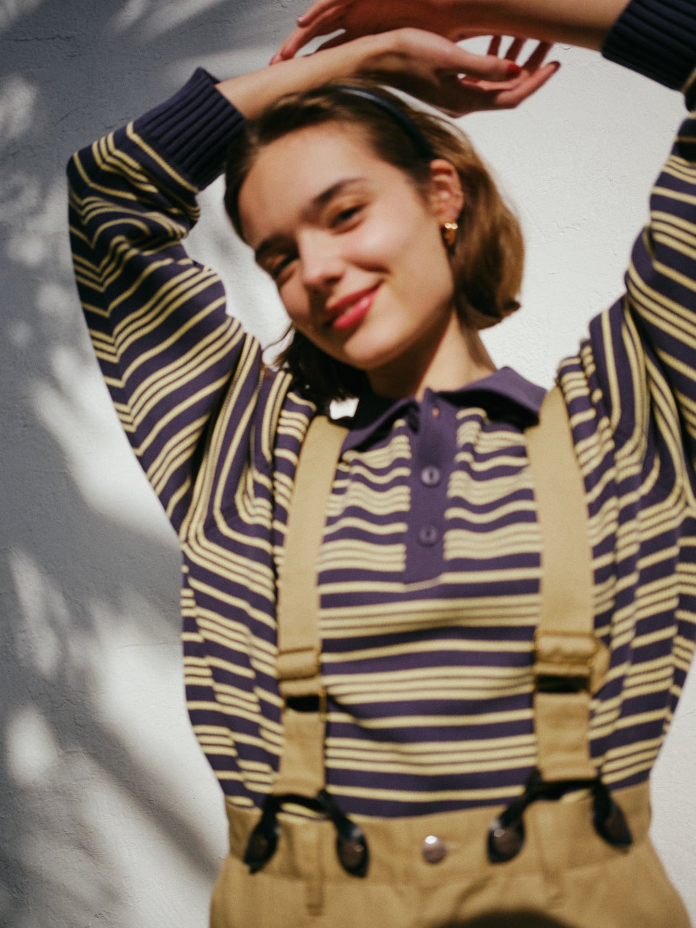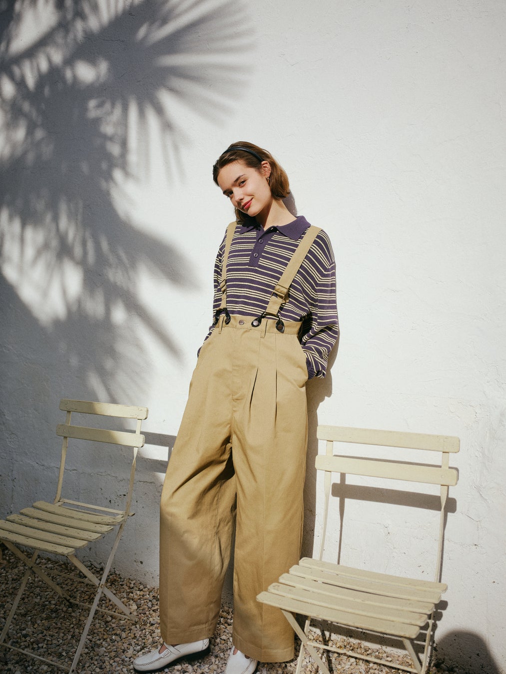 サロペットはメンズのワークパンツをイメージし、一から制作したRED KAPの別注サスペンダー付きパンツで、ワイドシルエットなので、コンパクトなトップスやフェミニンなブラウスと好相性。