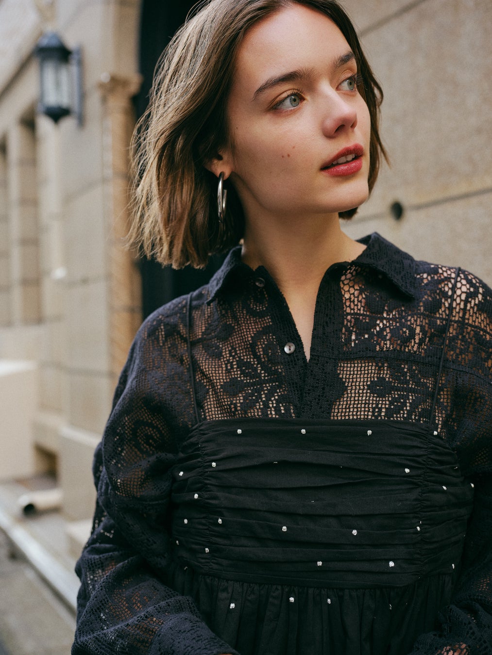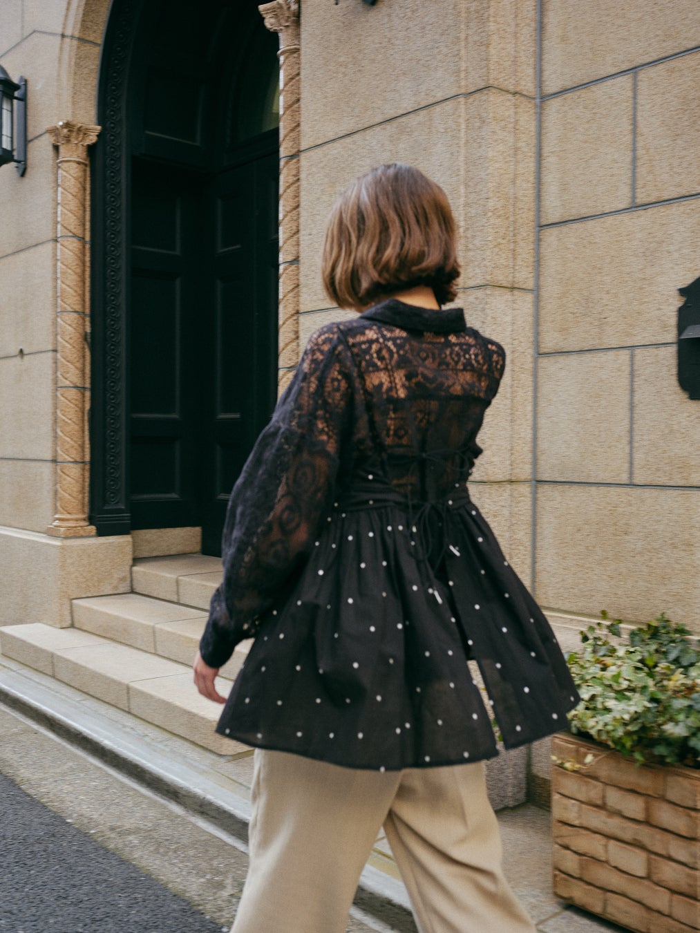 女性らしい品のある透け感が特徴のレースシャツとキャミワンピースで、大人のレイヤードスタイル。