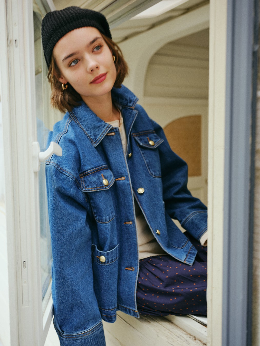 金釦が施されたデニムジャケットはカジュアルの中でフェミニンさをプラスした1枚。