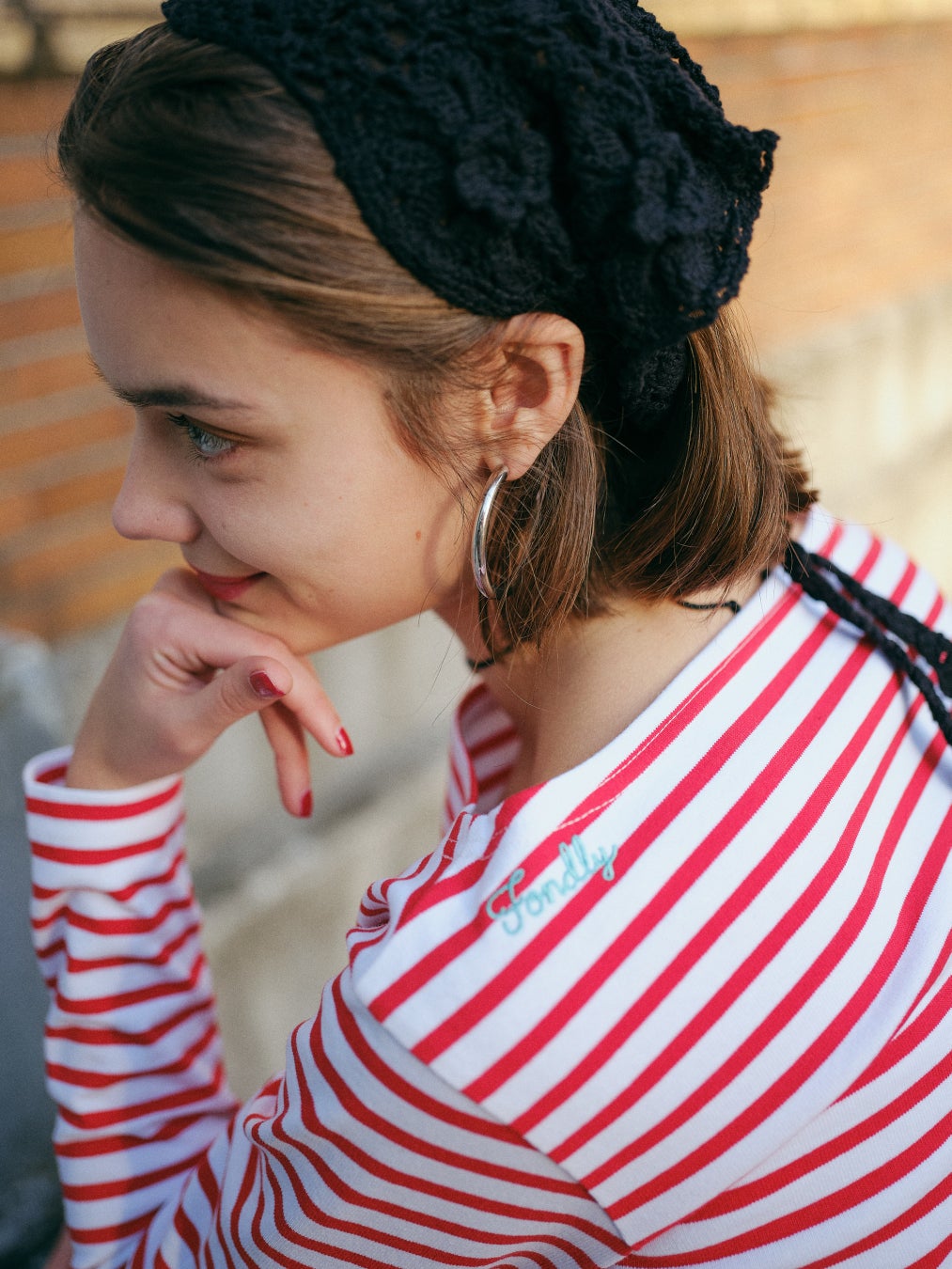 ワンポイントが目を引く飽きないデザイン性とクロシェスカーフで今年らしさを加えて。